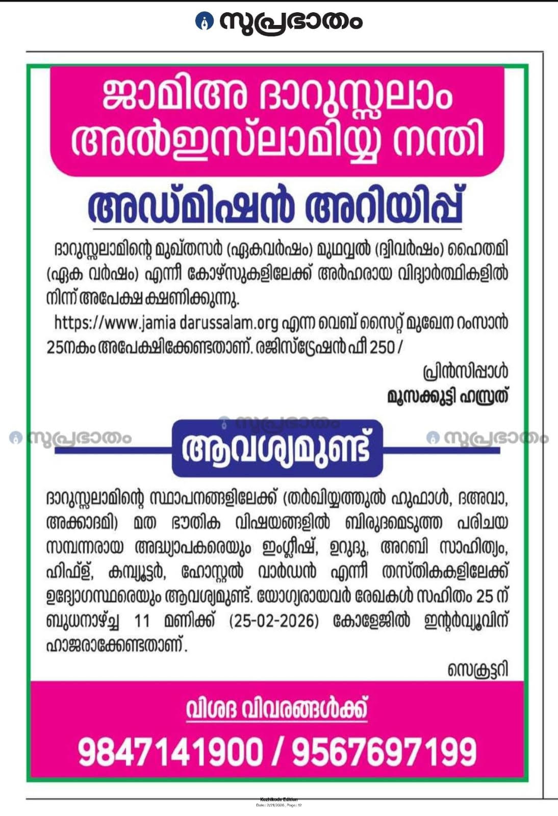 Darussalam Islamic University is a reputed educational centre in South India providing both secular and Islamic education for students. The courses offered include Quran, theology, Islamic jurisprudence, Fiqh, Hadith, history, culture, and more...